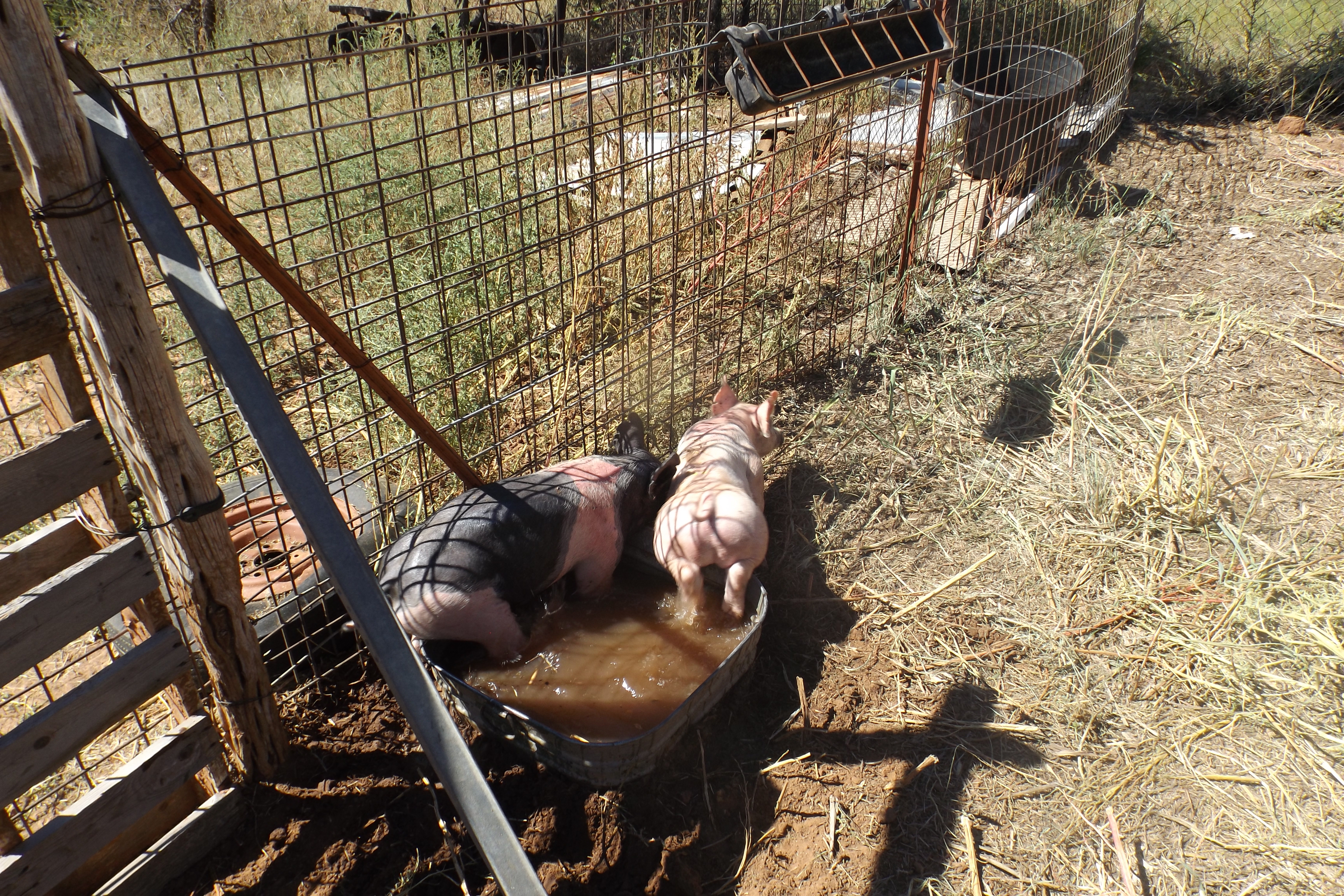 Well, we can’t take the pigs back, so we’re going to do this. Donald’s pig, Hamburger, looks to have very delicate skin. Shadrach’s pig, Blinky, looks a little more robust. However, both need some sunscreen if we want them to show well. We set up the video camera and got some good pictures of the whole experience. Here’s the link.